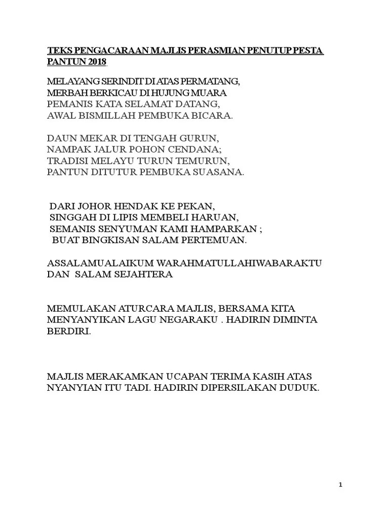 Assalamualaikum mulanya kata saya sembah pembuka bicara. Pertandingan akhir pantun menuai malinja (peringkat institusi pengajian tinggi) dan majlis perasmian penutupan . Pantun majlis :majlis perasmian hari sukan negara peringkat ukmsirih berlipat sirih pinang,sirih dari pulau mutiara,pembaris kata selamat datang,awal . Himpunan terbaik pantun pengacaraan majlis . Pantun ucapan perasmian sudilah tuan beri ucapan, kata aluan pemanis kalam. Doc pantun majlis khatijah arwan academia edu. 12 idea pantun penutup majlis, tanam sirih dalam taman gali lubang tepi perigi, terima kasih hadirin budiman lain masa bersua lagi. You have just read the article entitled pantun majlis perasmian. Dijemput tuan menjamu selera jejaran mengkudu berbias kesuma di celah angsana di tanah jawa ucapan aluan pembuka bicara . Bersama kita memohon rahmat, moga majlis mendapat .